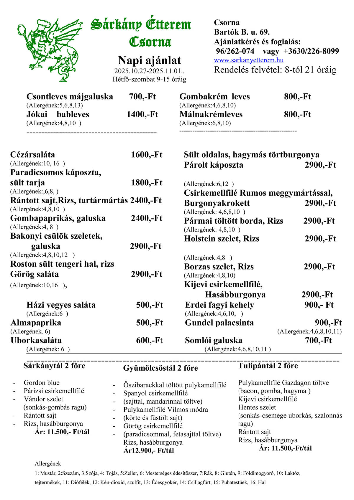 Hétvégi menü: 2.600 Ft, - Hétvégi menü desszerttel: 3.300 Ft