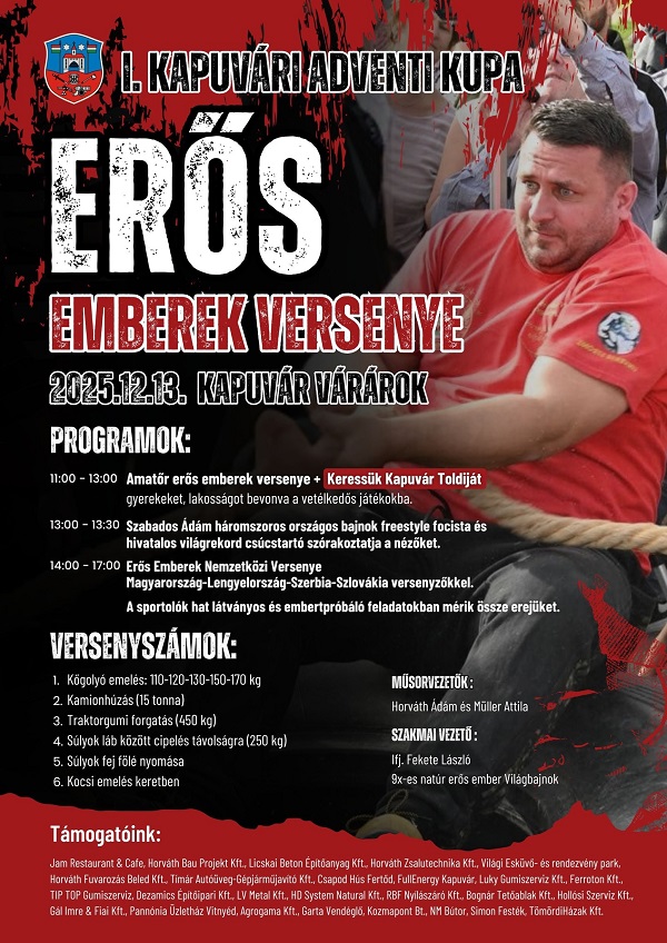 11:00–13:00 Amatőr erős emberek versenye, ahol keresik Kapuvár Toldiját! A gyerekeket és a lakosságot játékos vetélkedők, közös erőpróbák várják.