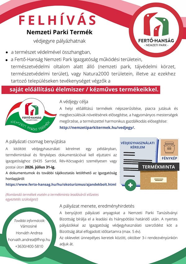 A Fertő-Hanság Nemzeti Park Igazgatóság pályázatot hirdet a „Nemzeti Parki Termék” védjegy használatára.