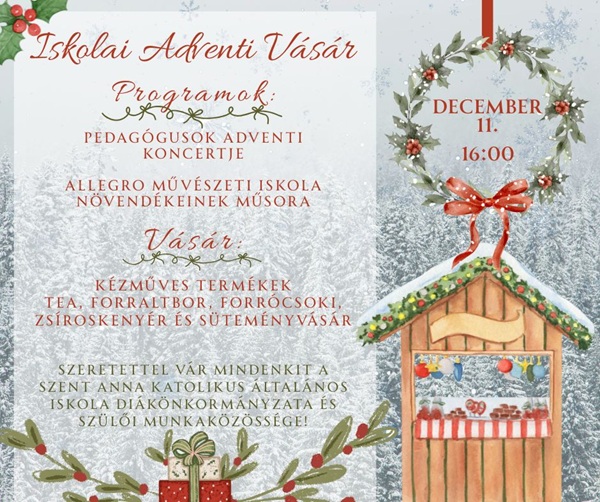 Szeretettel hív mindenkit az Iskolai Adventi vásárra a szanyi Szent Anna Katolikus Általános Iskola Diákönkormányzata és Szülői Munkaközössége december 11-én 16:00 órától!