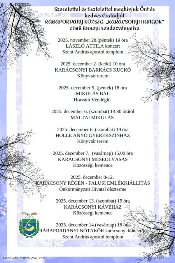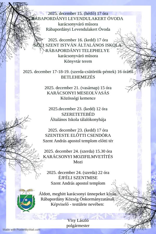 Rábapordány Község Önkormányzata szeretettel várja a lakosokat és vendégeket a karácsonyi programsorozatra.