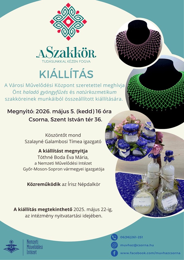 A csornai Városi Művelődési Központ szeretettel meghívja Önöket haladó gyöngyfűzés és natúrkozmetikum szakköreinek munkáiból összeállított kiállítására.