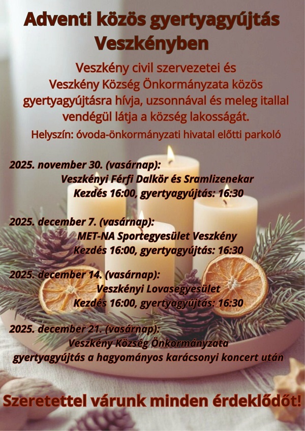 Veszkény civil szervezeti és Veszkény Község Önkormányzata közös gyertyagyújtással és programokkal várja a lakosokat minden adventi vasárnap.