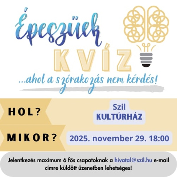 Ahol a szórakozás nem kérdés. A következő szili kvízest időpontja: november 29. 18 óra. Jelentkezni a hivatal@szil.hu e-mail címen vagy a 96/275-191-es számon - csapatnévvel és létszámmal (maximum 6 fő) lehet.