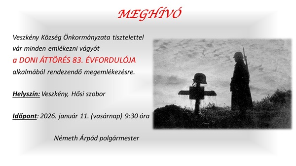 Veszkény Község Önkormányzata tisztelettel vár minden emlékezni vágyót a doni áttörés 83. évfordulója alkalmából rendezett megemlékezésre.