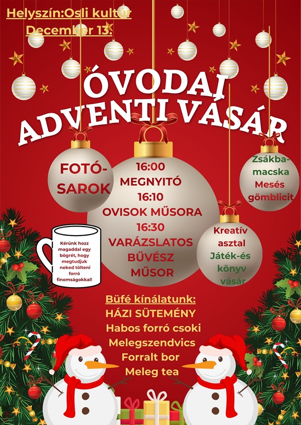 Adventi vásár fotósarokkal, kreatív foglalkozásokkal, zsákbamacskával és műsorokkal.