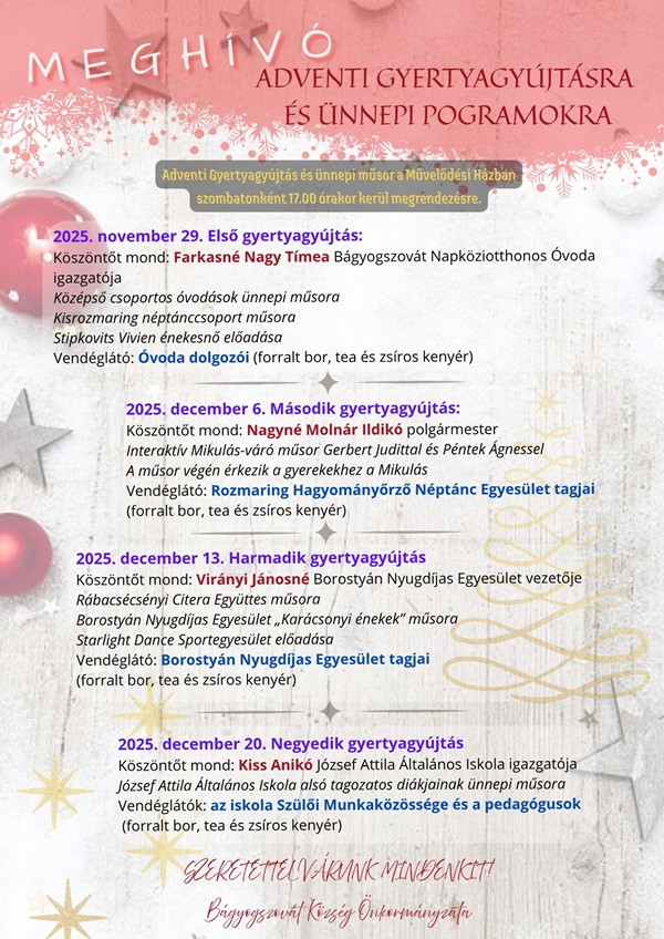 Adventi gyertyagyújtás és ünnepi programok szombatonként 17 órától a bágyogszováti Művelődési Házban.