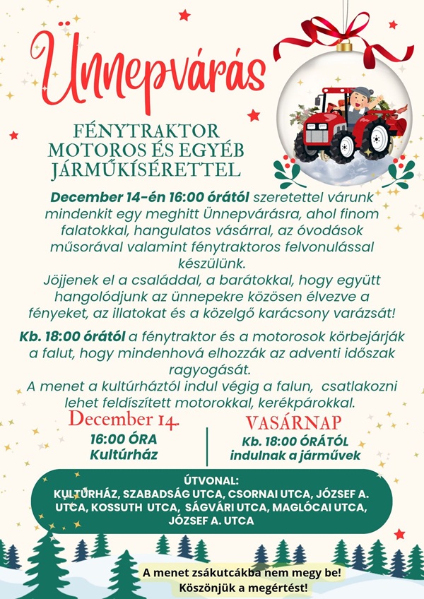 Közös hangolódás az ünnepre 16 órától a Kultárházban. A fénytraktoros menet 18 órakor indul.
