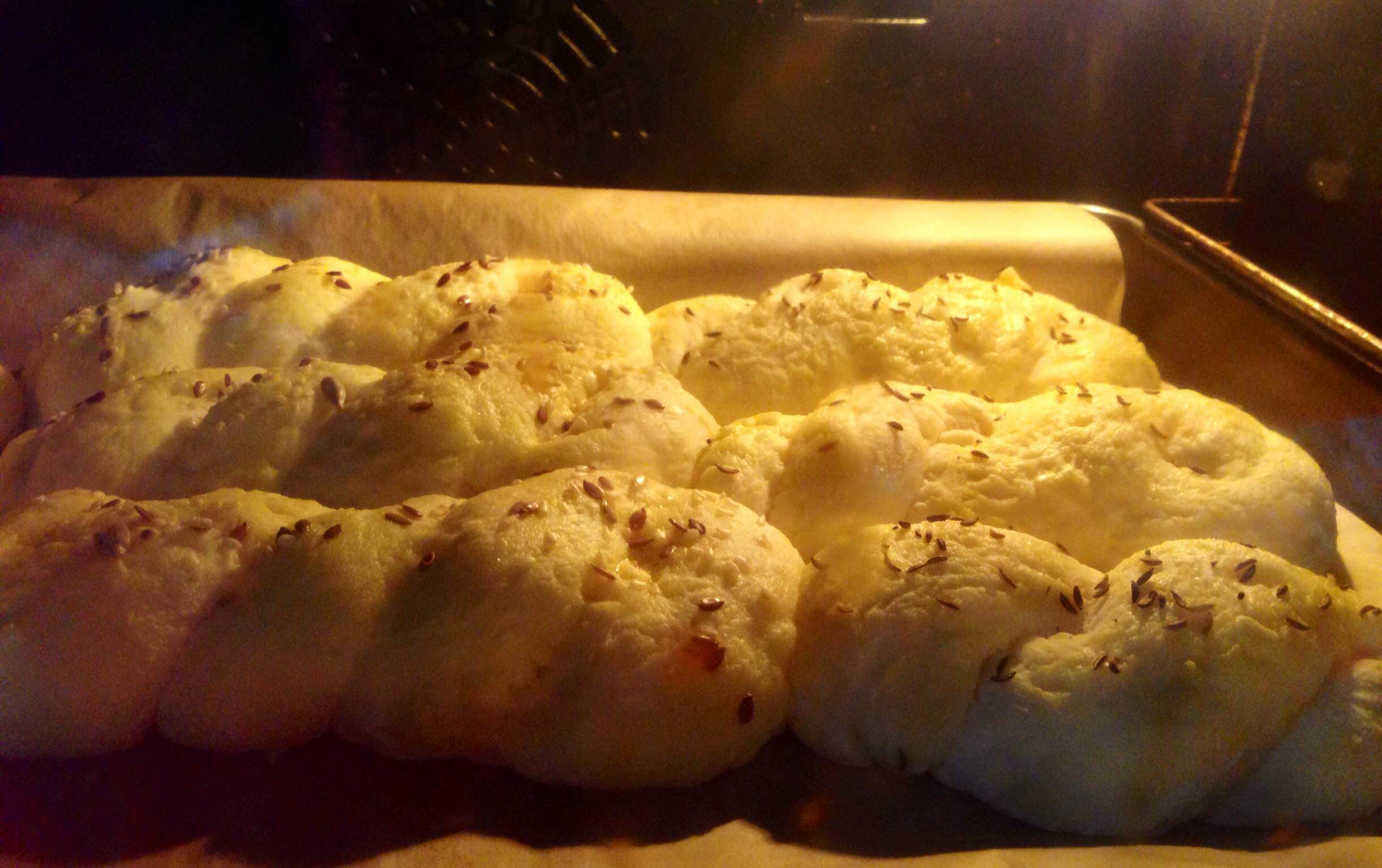 A mini fonott kalácsokat egy sütőpapírral bélelt tepsibe tettem, tetejüket lekentem felvert tojással és megszórtam köménymaggal, néhányat pedig vegyes magkeverékkel.