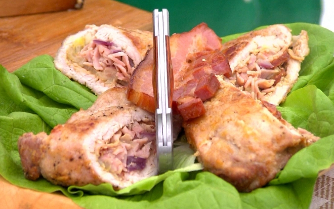 A húsos szalonnából kis kockákat vágunk, kevés zsíron kisütjük. Ezután hozzáadjuk a vékony szeletekre vágott hagymákat, a csíkokra vágott sonkát, és együtt megdinszteljük. A töltelékből vékonyan rásimítunk a széthajtott karaj egyik felére, majd 3-4 karikára vágott kolbászt is ráhelyezünk, és a hús szabadon hagyott felét visszahajtjuk a töltelékes részére. Hústűvel a nyitott oldalait megtűzzük, mindkét oldalát lisztbe forgatjuk, és forró zsírban pirosra sütjük. Közben a maradék húsos szalonnát felszeleteljük, fél centinként bevagdossuk mint egy kakastaréjt, és mindkét oldalát kisütjük. Amikor a hús megsült, félbevágjuk, és egy-egy szelet sült szalonnát a tetejére téve tálaljuk. Köretnek sült burgonya és grillezett gomba illik hozzá.