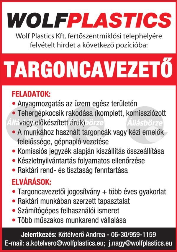 Autóipari beszállító partnercégünk részére keresünk Targoncás, Varrónő és Operátor munkatársakat Mosonszolnokra. Műszakokra való bejárás műszakos járattal vagy tömegközlekedéssel lehetséges, melyet 100%-ban térítünk. Jelentkezés: 06/30-924-6540 - viktoria.nagy@kellyservices.hu