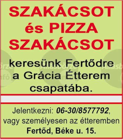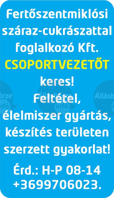 Kapuvári munkahelyre sütőipari segéd- és betanított munkást keresünk. Érd.: 06-30/237-6765