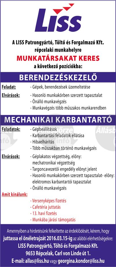 Licskai Beton- Építőanyag Telep gépkocsivezetőt keres Elvárás: GKI, „C+E” jogosítvány, nehézgépkezelői jogosítvány Jelentkezés személyesen irodánkban: Kapuvár, 9330 Kisfaludy sor 15.