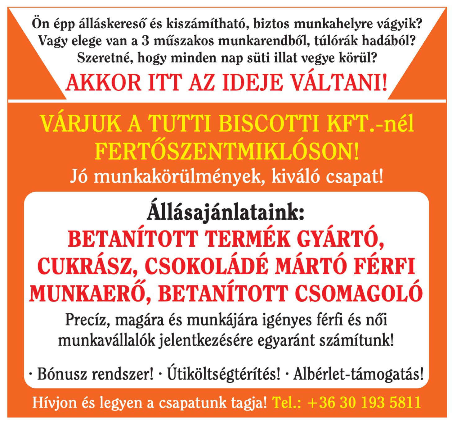 Jánossomorjára várjuk 2 műszakos munkarendbe női, férfi munkaerő jelentkezését egyszerű betanított csomagolási dobozolási munkára. Az utazás Mosonmagyaróvárról, Csornáról. Bősárkányból céges járattal megoldott.( más településekről a bejárást térítjük). Versenyképes bérezés, szállástámogatás, cafeteria Érd.: +36 80/200-218, +3630/530-4028 Nyilv.szám: 10/2011