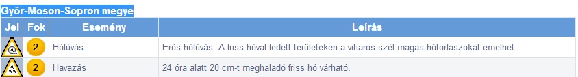Az Országos Meteorológiai Szolgálat másodfokú, narancssárga riasztást adott ki Győr-Moson-Sopron megyére, mivel az előrejelzések alapján az eddig lehullott, harminc centiméternyin felül nagy mennyiségű friss hó várható.