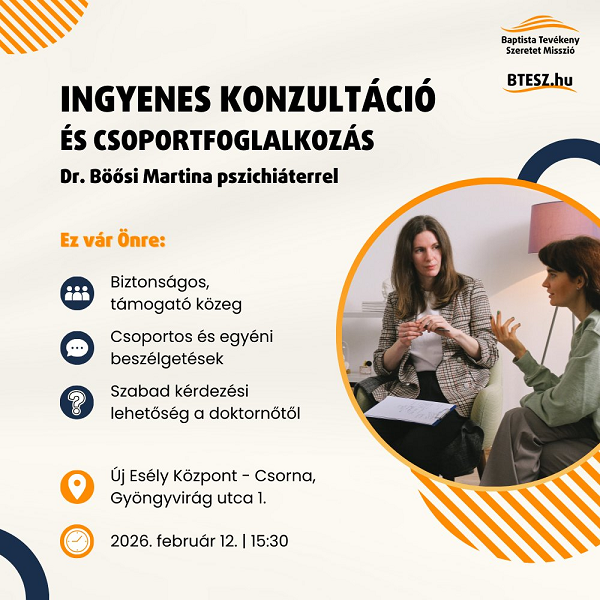 Dr. Böősi Martina pszichiáter ingyenes csoportfoglalkozást és egyéni konzultációt tart a csornai Új Esély Központban, ahol egy biztonságos, elfogadó közegben lehet beszélgetni, kérdezni és segítséget kérni.