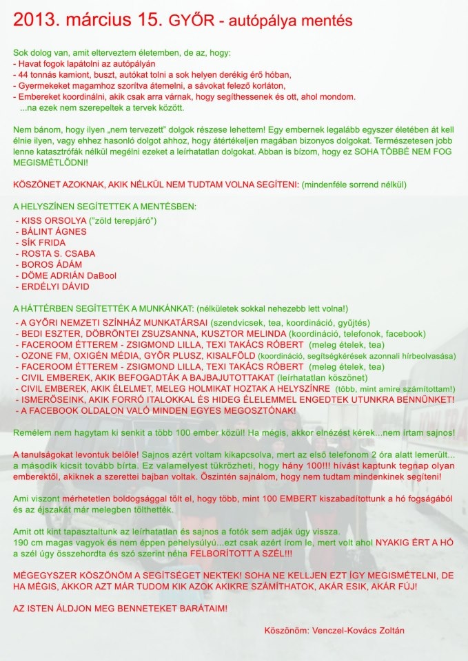 Aki ismer, az tudja, hogy ezt a „kis” bejegyzést nem a szereplési vágyam ihlette, hanem az, hogy megtudják minél többen, pontosan mi is történt és, hogy kik is segitettek valójában az elakadt embereknek az M1-ES AUTÓPÁLYA 95-100 km közötti részénél. Nem tudom, hogy máshol mi történt, de ezen a pályaszakaszon én is ott voltam több mint 24 órát a hófúvásban, ebből az idő nagy részében az autómban, magamra hagyva, viz és élelem nélkül. A sajtóban megjelent, hivatalos szervek általi jelentések, valamint a valóságban történtek között óriási különbség van. Nem hibáztatni és másokra újjal mutogatni szeretnék, csak leirni, hogy talán, ha máskor máshogy csinálják, csináljuk, akkor ez nem ismétlődik meg!