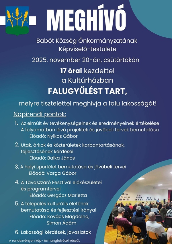 Babót Község Önkormányzata szeretettel várja a falu lakóit a falugyűlésen.
