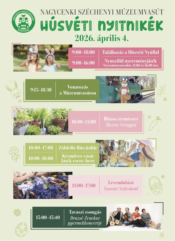 Programok: kisvasutazás a múzeumvasúton kézműves foglalkozások – levendulás ajándékkészítés gyógynövény bemutató Martos Virággal Drazsé Zenekar gyermekkoncert játékcsere-bere nyuszifül nyereményjáték