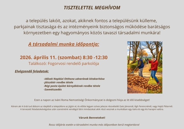 Idősek Napközi Otthona udvarának kitakarítását, a játszótér, a régi posta épület és környékének rendbe tételét, szemétszedést szervez az önkormányzat.